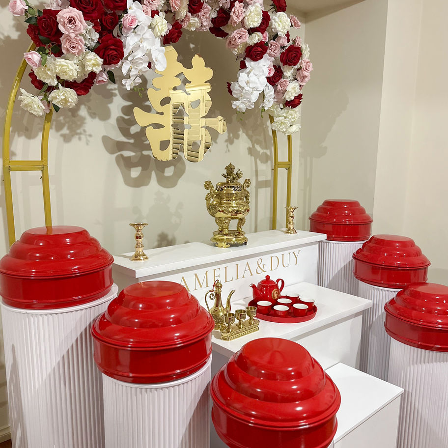 An opulent tea ceremony setup featuring a gold-accented altar, tiered tables for traditional red trays, a floral arch, and ceremonial décor — designed to bring grandeur and meaning to your special day.